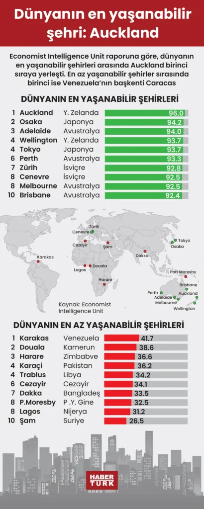 En Yaşanabilir Şehirler kavramı, yaşanabilirlik kriterlerinin şehirler arası karşılaştırmasında kilit rol oynar ve güvenlik, sağlık, ulaşım ile yeşil alanlar gibi unsurları içerir.Yaşam kalitesi yüksek şehirler olarak adlandırılan bu yerler, temiz hava, düşük kirlilik, kapsayıcı sosyal hizmetler ve sürdürülebilir konut dengesiyle öne çıkar.